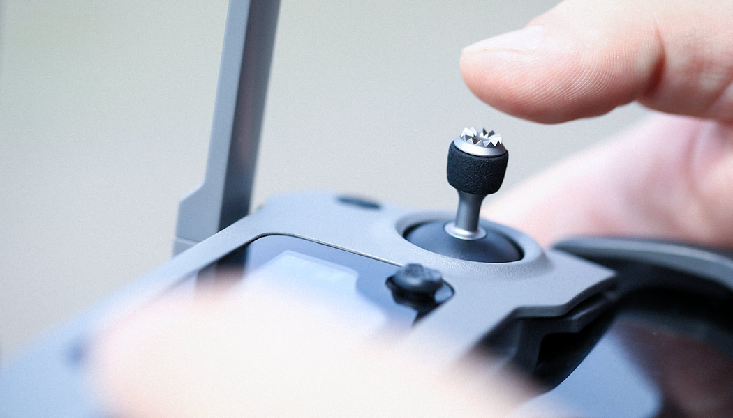 Photo of a hand holding modern flying drone remote, navigating it with joystick