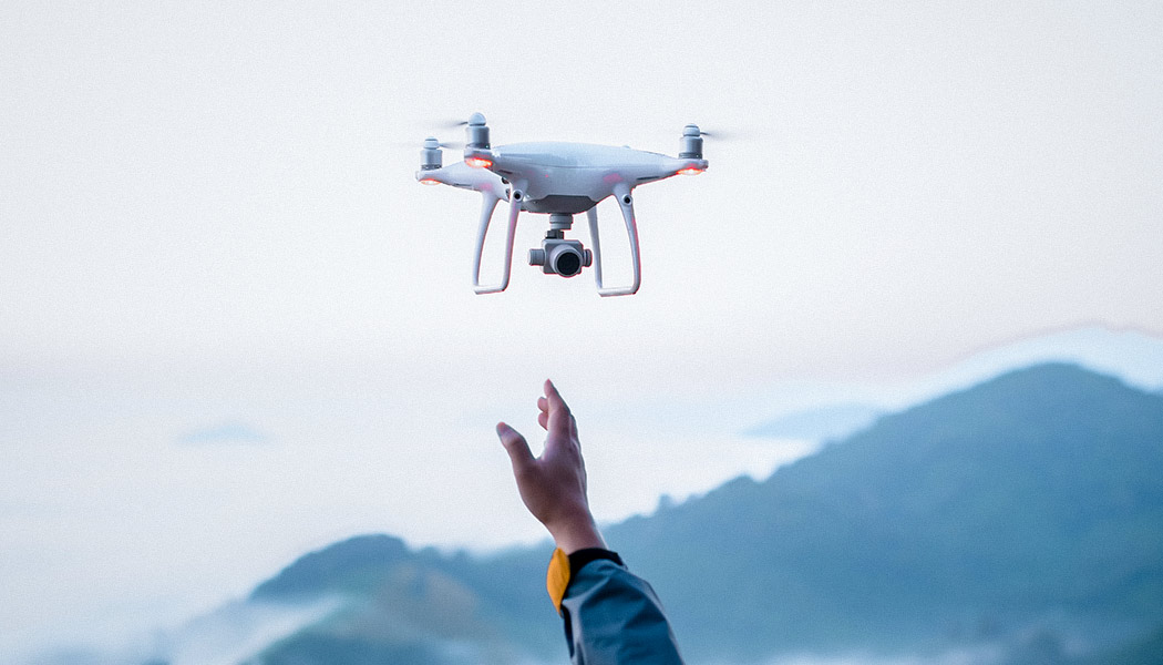 A pair of hands opened to reveal a holographic wireframe of a drone and its key components